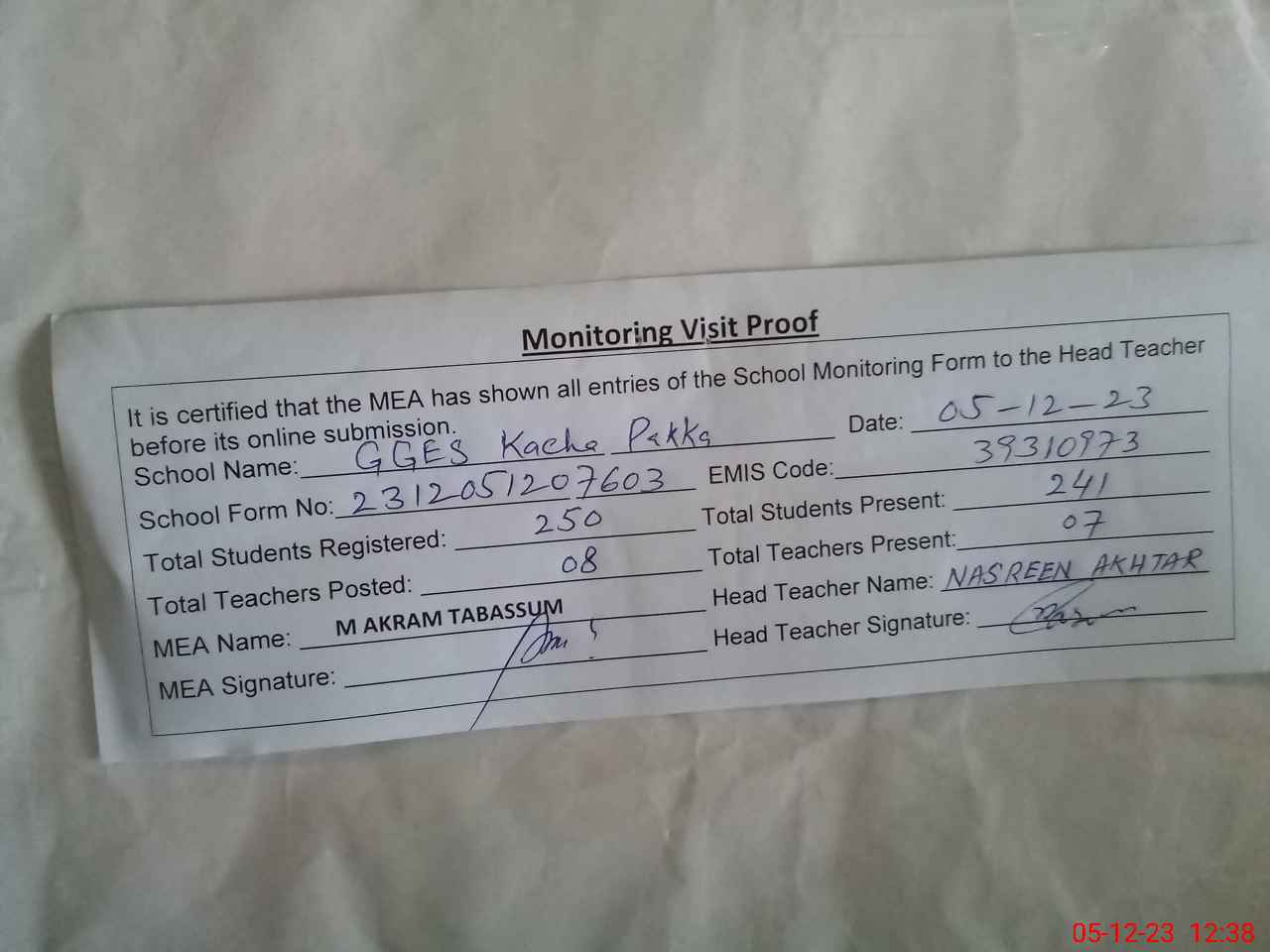 | Attendance Register | Head Teacher | MEA with School | Visit Proof |