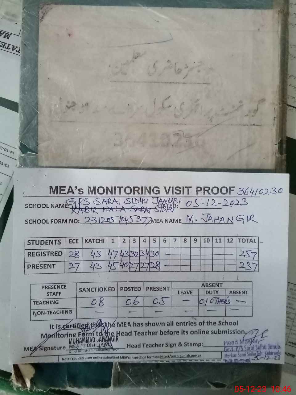 | Attendance Register | Head Teacher | MEA with School | Visit Proof |