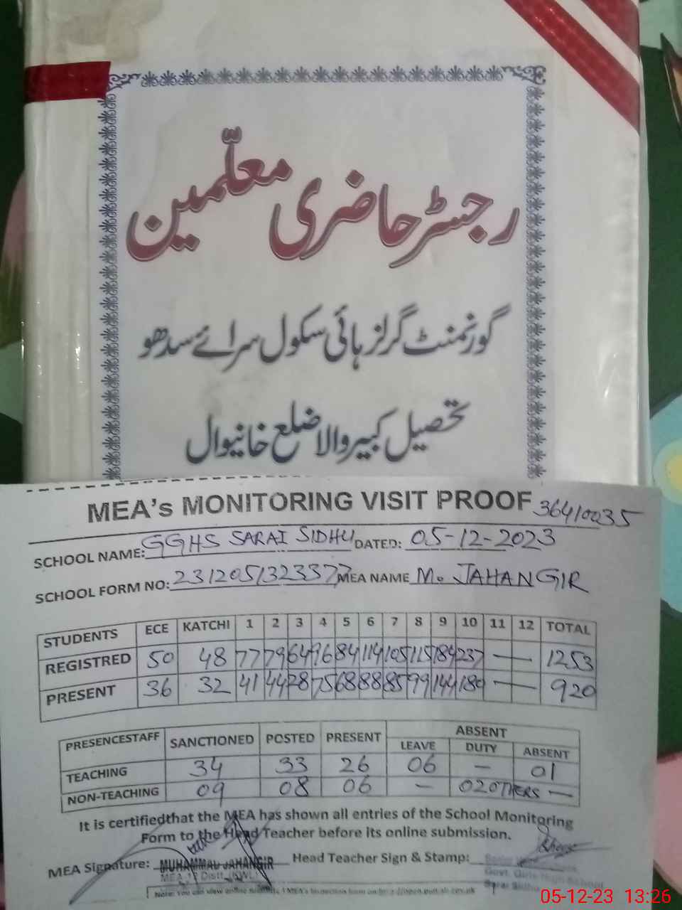 | Attendance Register | Head Teacher | MEA with School | Visit Proof |