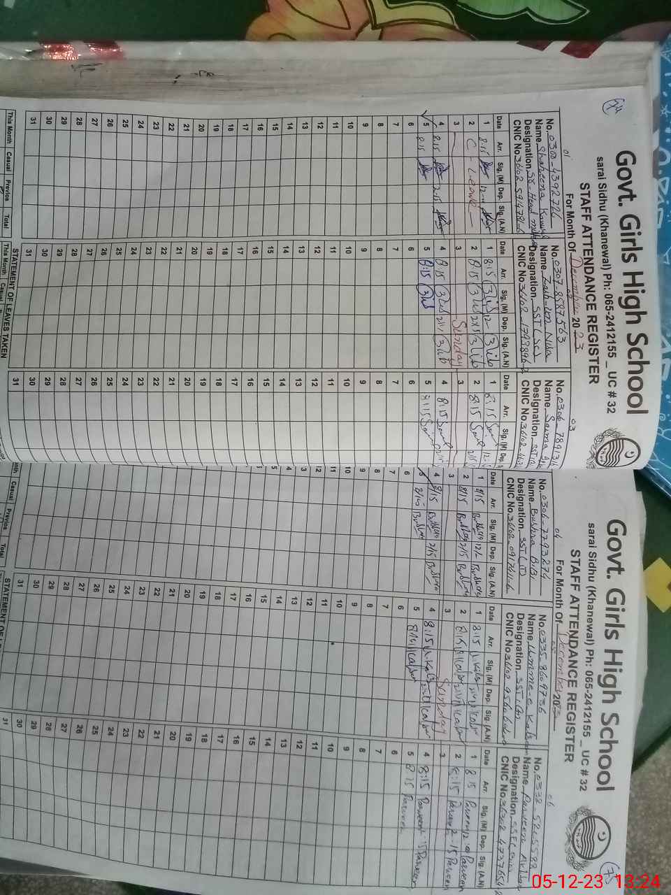 | CNIC | Full Name | Designation | R/C | Absence during last cal. month |