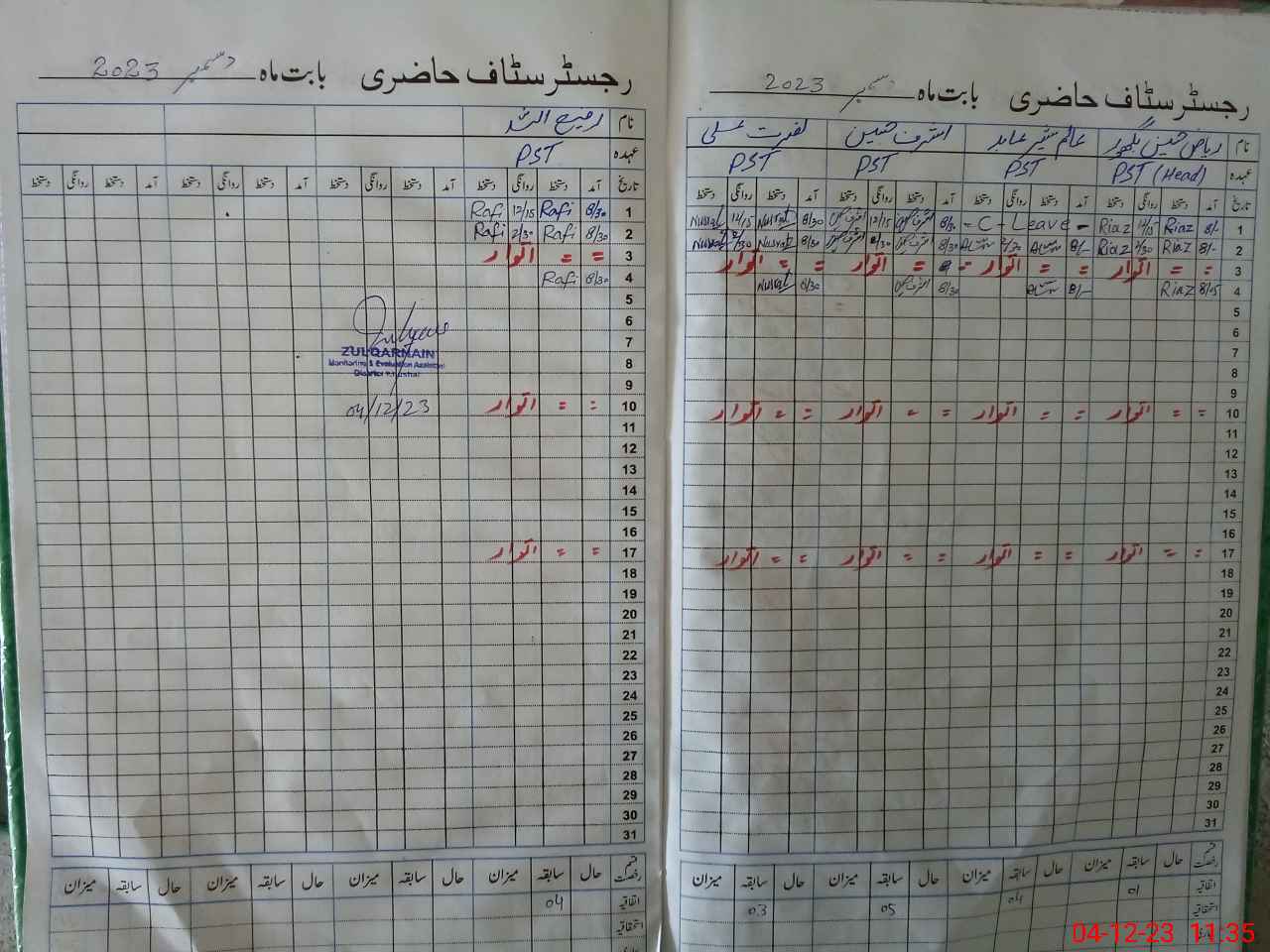 | CNIC | Full Name | Designation | R/C | Absence During Last Calender Month |