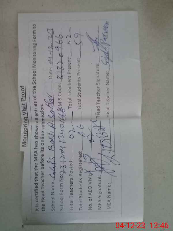 | Attendance Register | Head Teacher | MEA with School | Visit Proof |