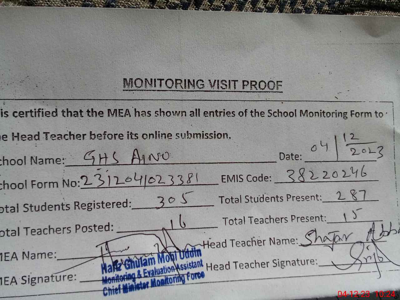 | Certified that this School was Inspected by the Undersigned MEA/DMO Today and the Information Stated Above is as Per Record. | |||||