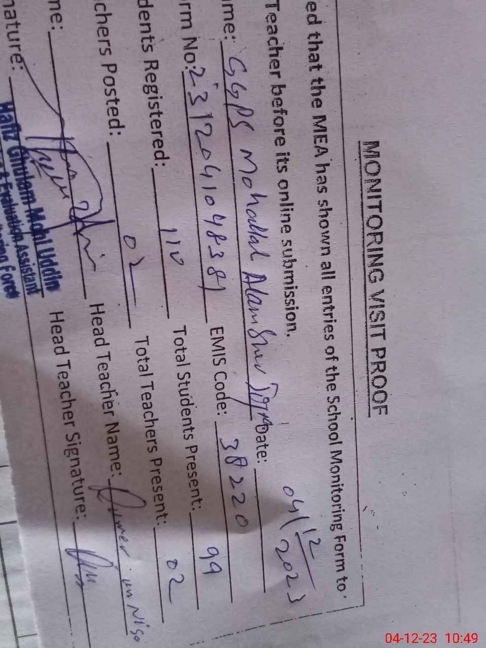 | Attendance Register | Head Teacher | MEA with School | Visit Proof |