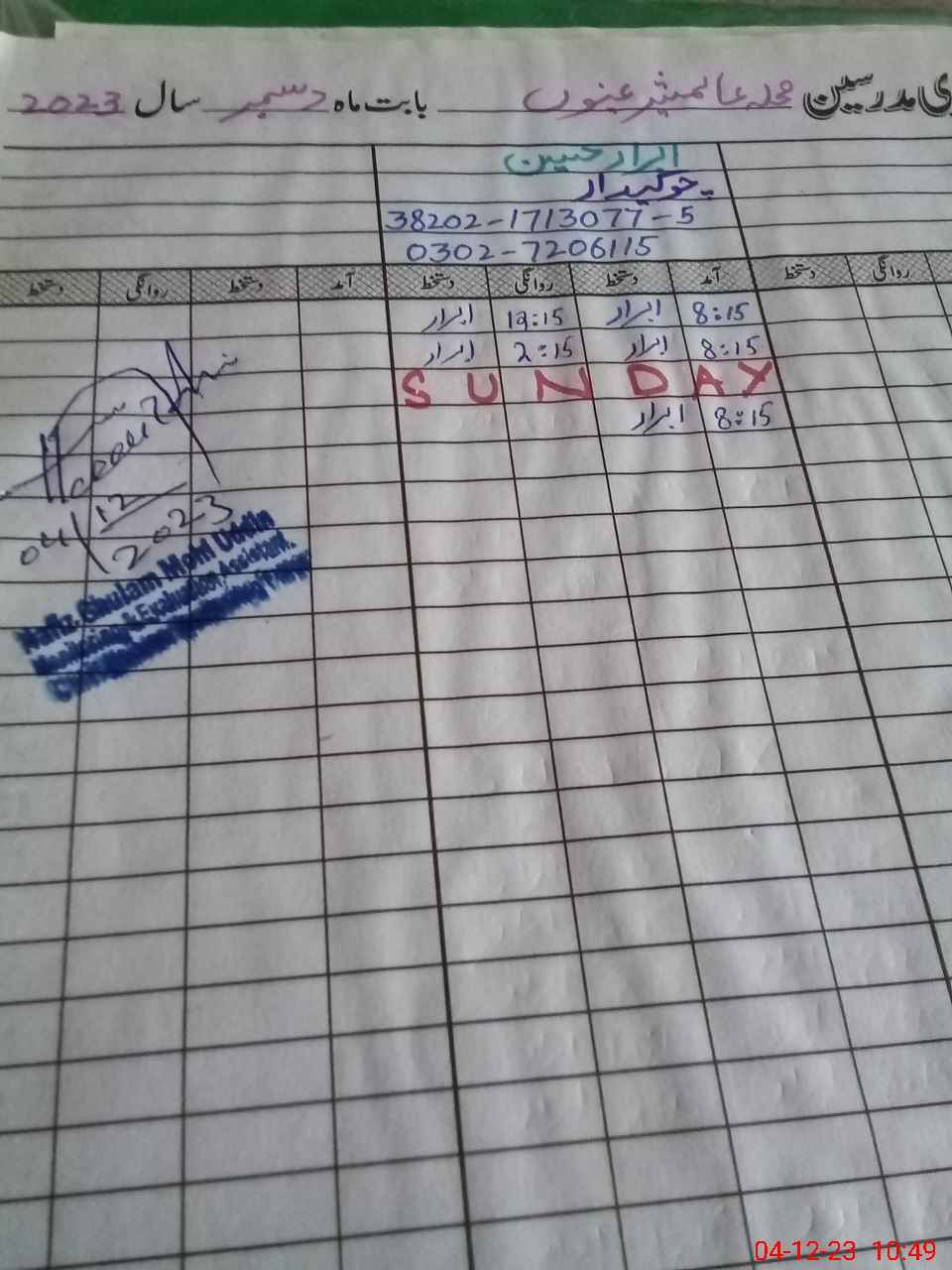 | Name: QA**** UNNI**** Designation: (School Headmaster's/Headmistress's) PST Phone/Cell Number: 03**** |