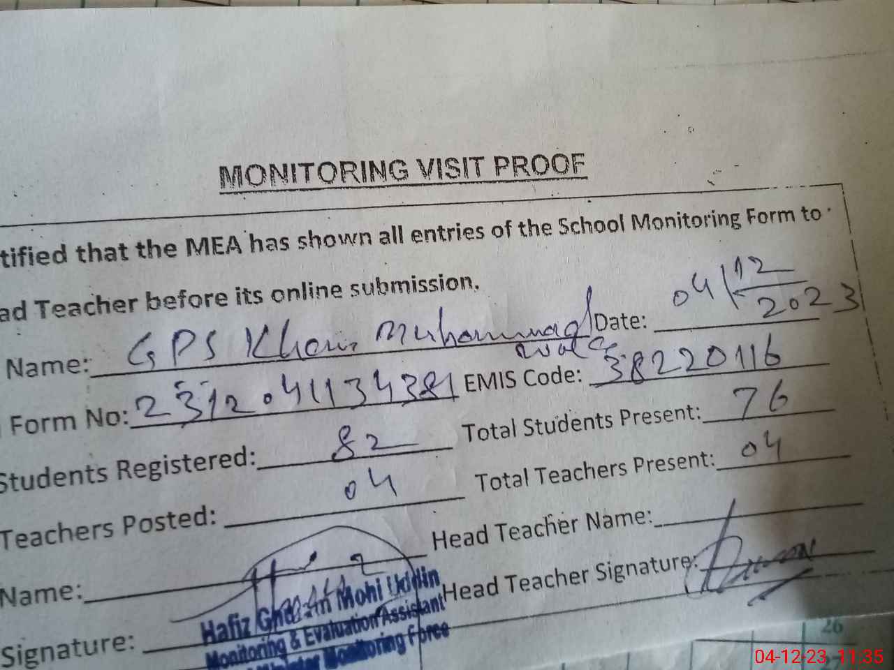 | Attendance Register | Head Teacher | MEA with School | Visit Proof |