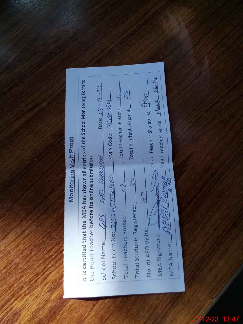 | Attendance Register | Head Teacher | MEA with School | Visit Proof |