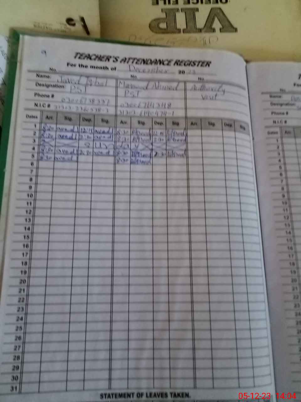 | CNIC | Full Name | Designation | R/C | Absence During Last Calender Month |