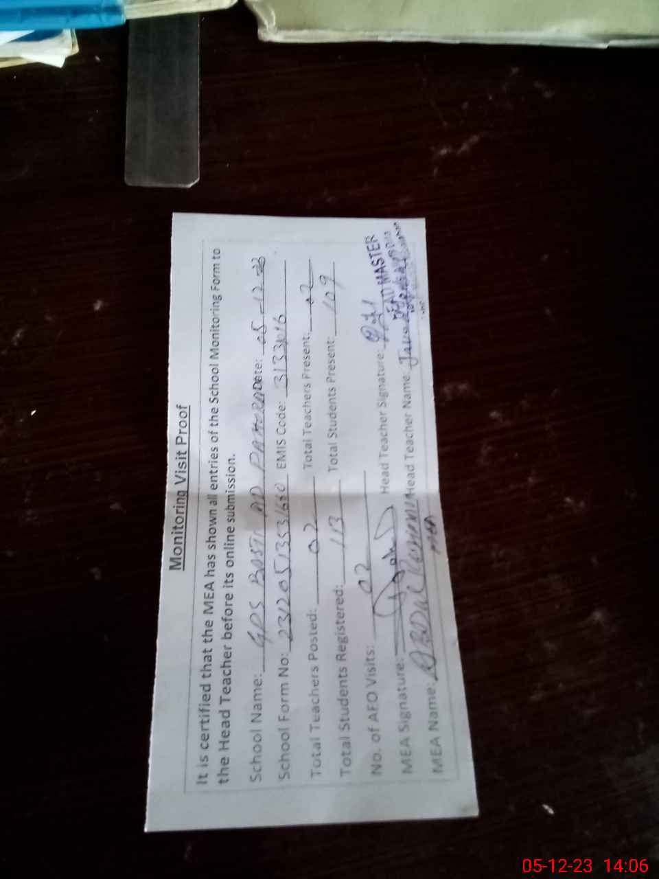 | Attendance Register | Head Teacher | MEA with School | Visit Proof |