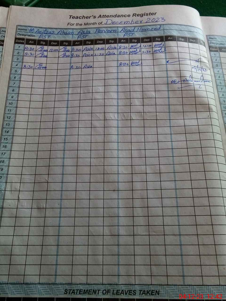 | CNIC | Full Name | Designation | R/C | Absence During Last Calender Month |