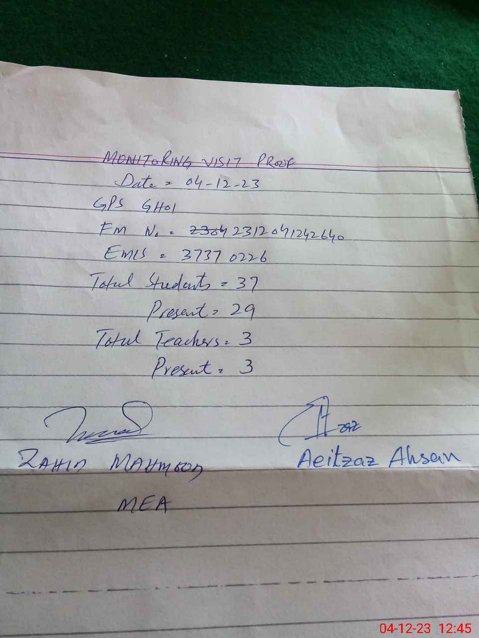 | Monitoring Date: 04-12-2023 | Start Time: 04-12-2023 12:34 PM | End Time: 04-12-2023 01:01 PM | Name of MEA: Za**** Me**** | |