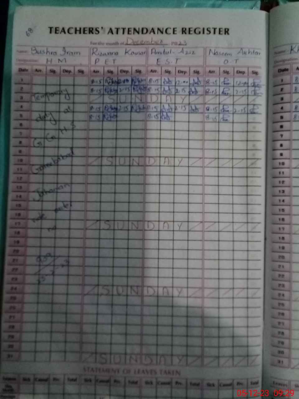 | CNIC | Full Name | Designation | R/C | Absence During Last Calender Month |
