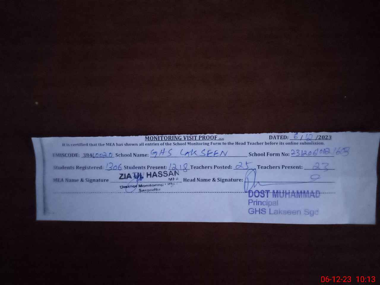 | EMIS Code: 38460020 | Name of School: GHS LAKSEEN | |||