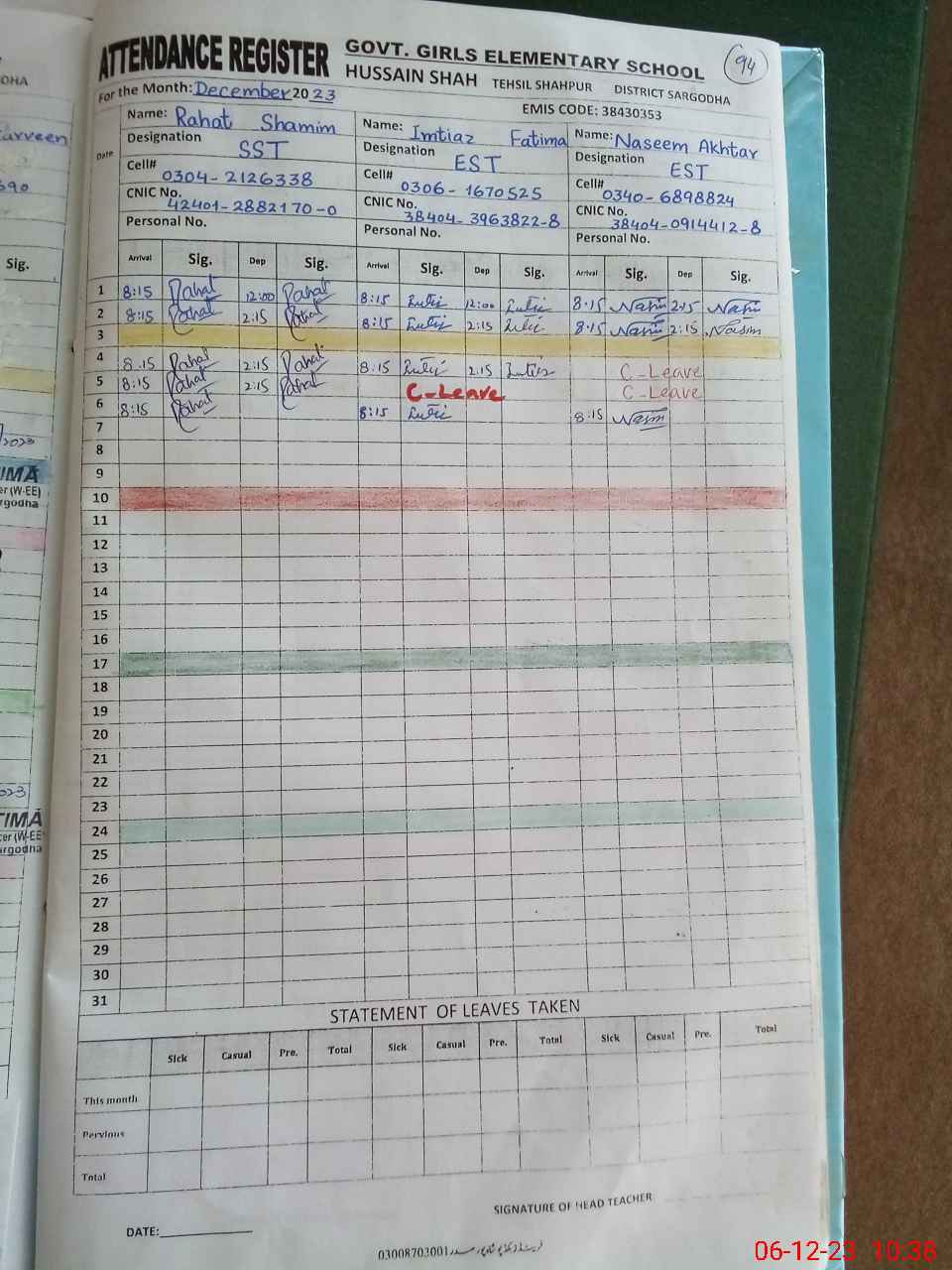 | CNIC | Full Name | Designation | R/C | Absence During Last Calender Month |