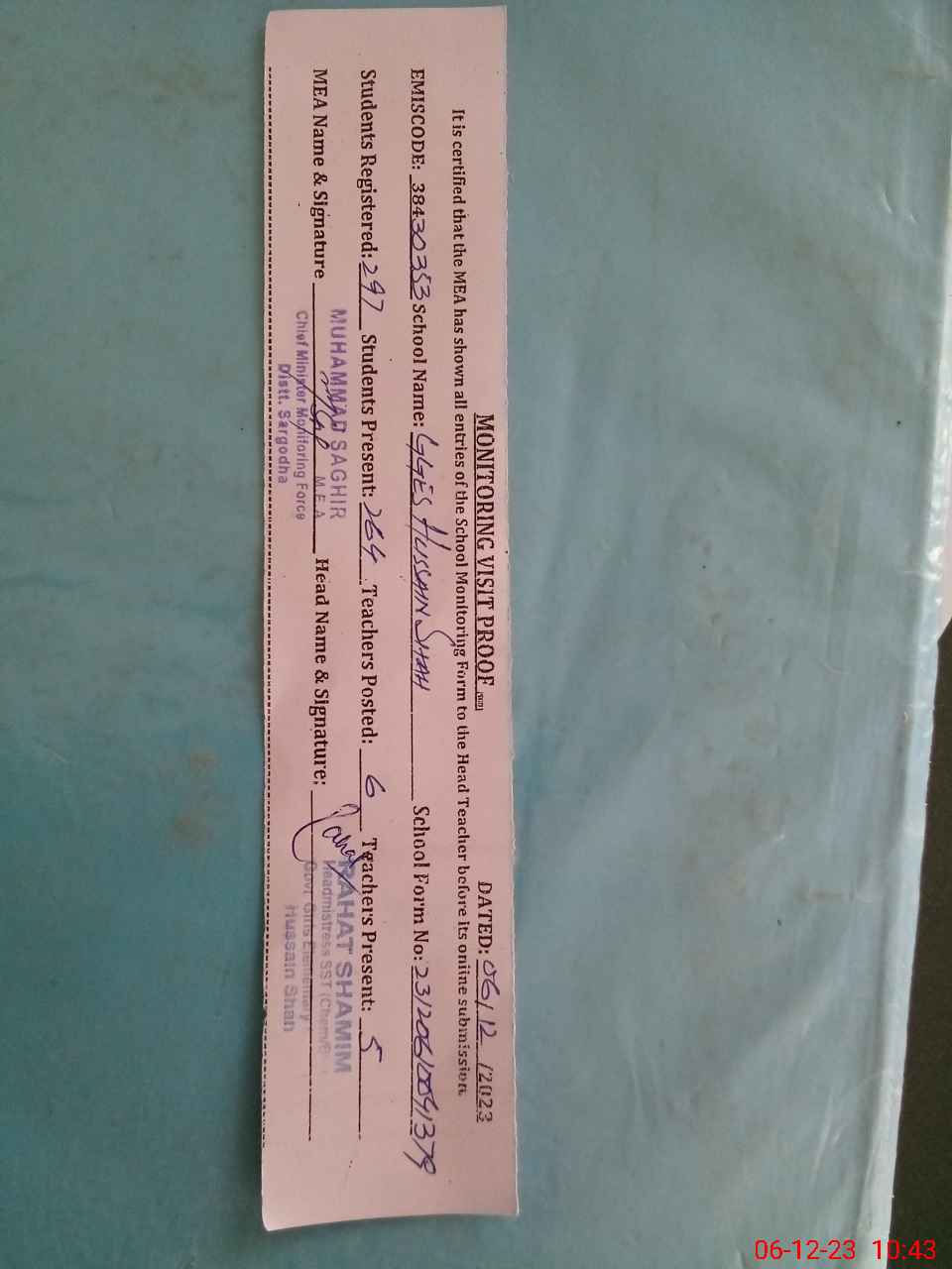 | Certified that this School was Inspected by the Undersigned MEA/DMO Today and the Information Stated Above is as Per Record. | |||||