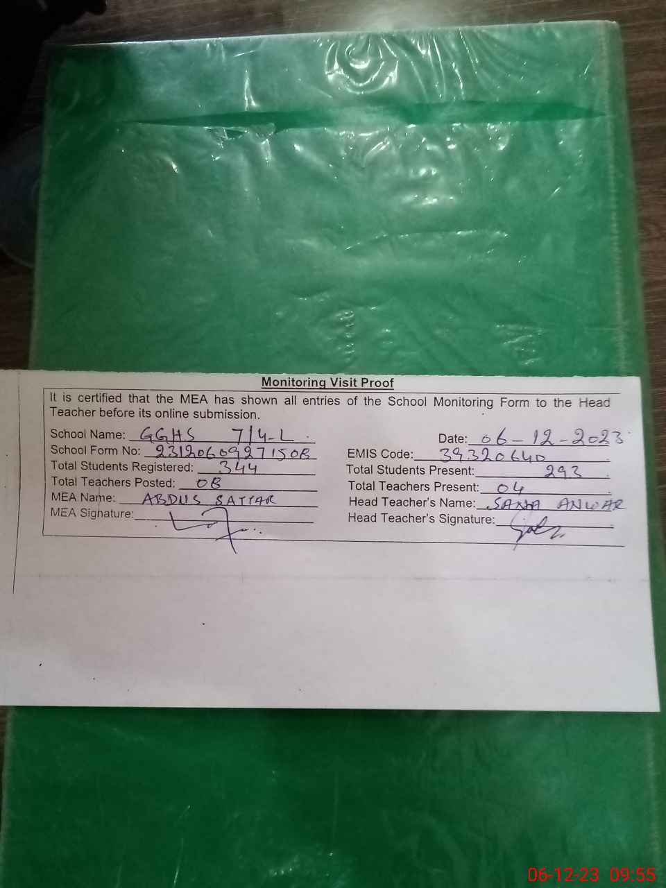 | Attendance Register | Head Teacher | MEA with School | Visit Proof |
