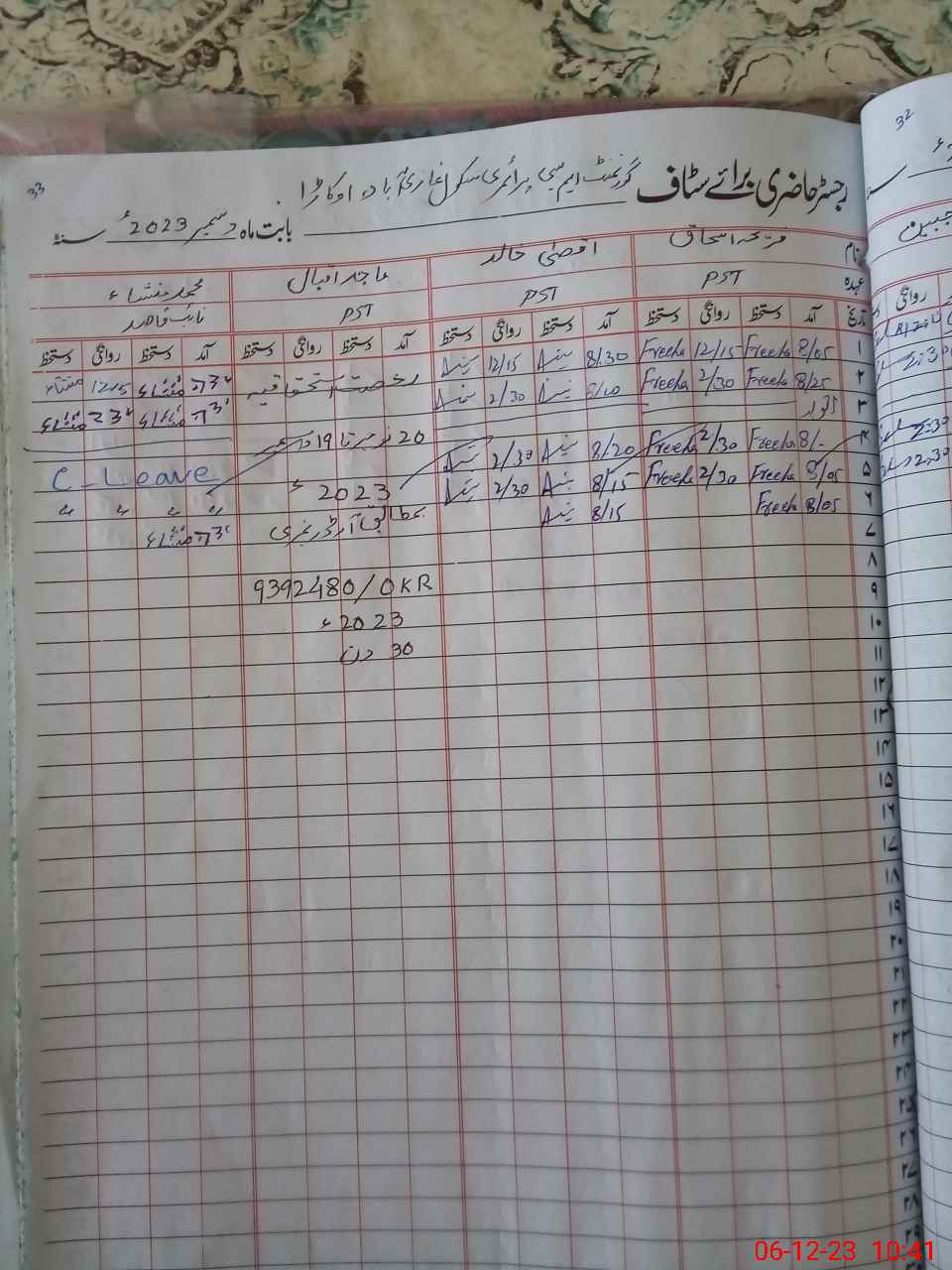 | CNIC | Full Name | Designation | R/C | Absence During Last Calender Month |