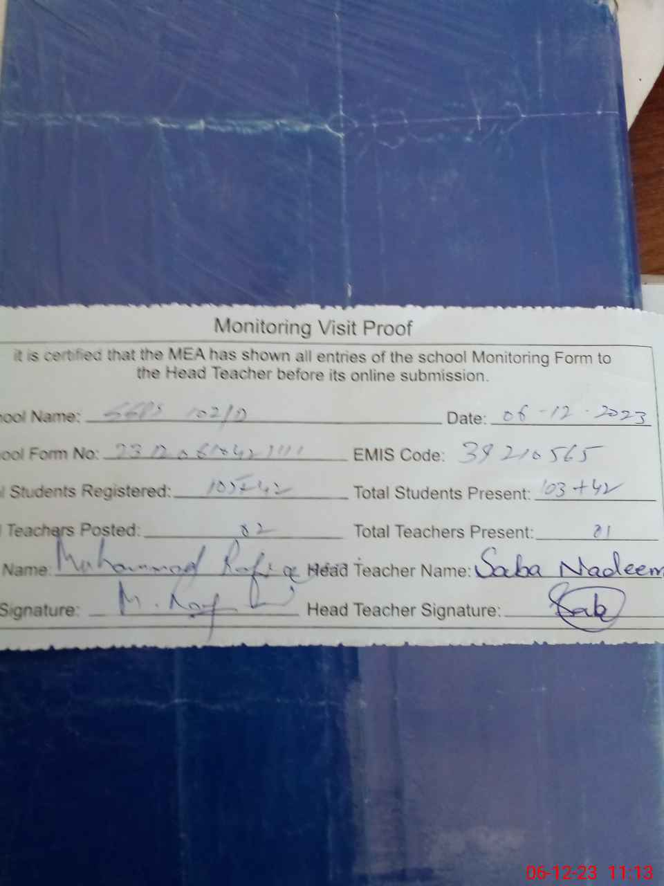 | Attendance Register | Head Teacher | MEA with School | Visit Proof |