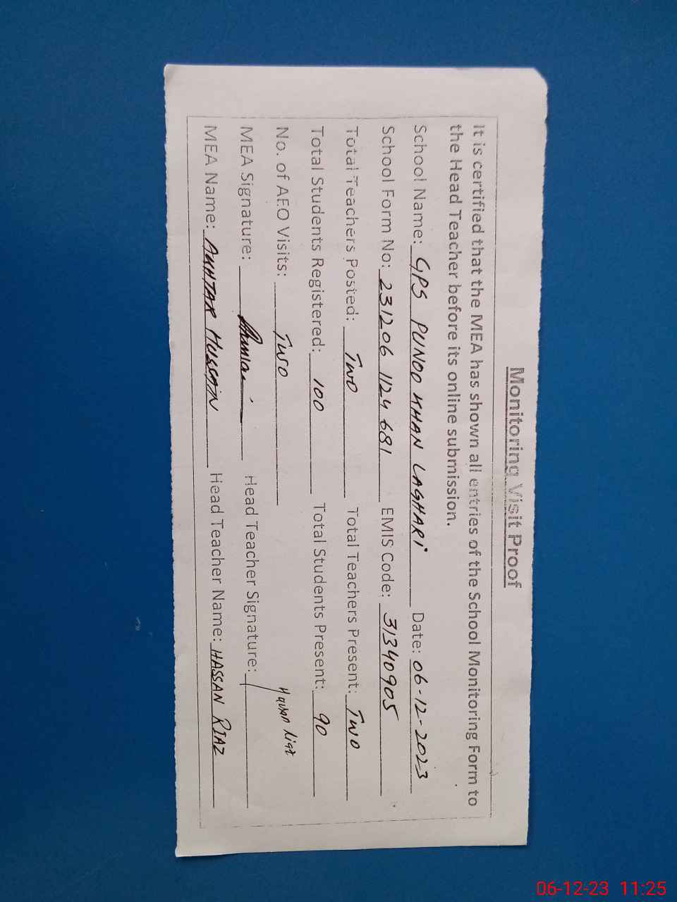 | Attendance Register | Head Teacher | MEA with School | Visit Proof |