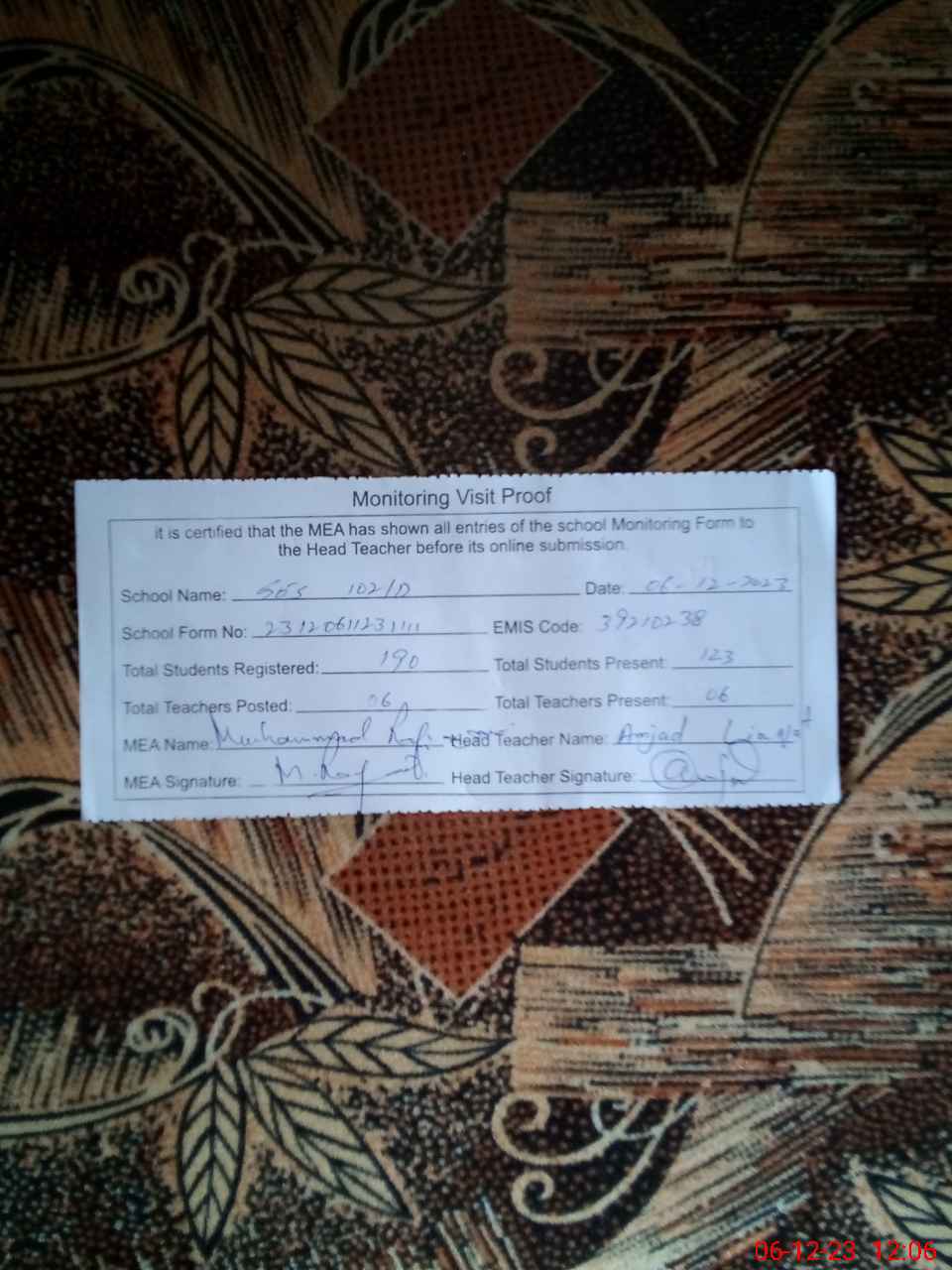 | Attendance Register | Head Teacher | MEA with School | Visit Proof |