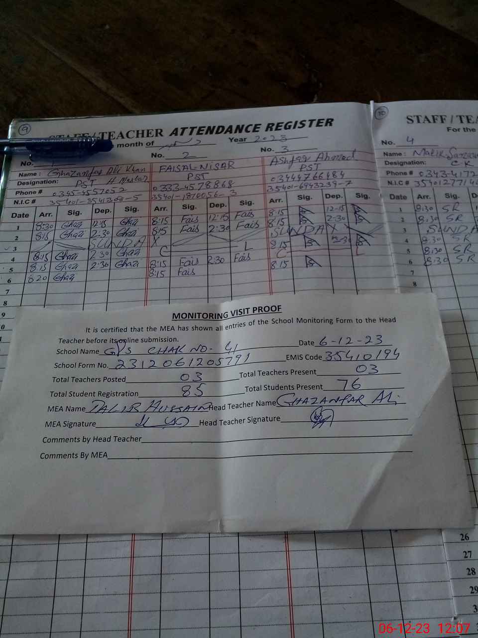 | Attendance Register | Head Teacher | MEA with School | Visit Proof |