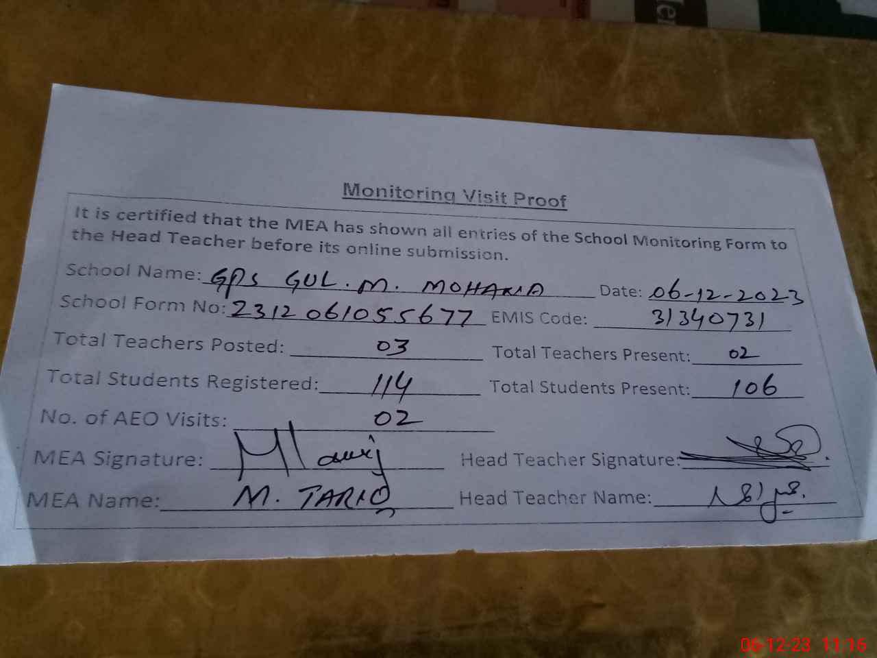 | EMIS Code: 31340731 | Name of School: GPS GUL MUHAMMAD MOHANA | |||
