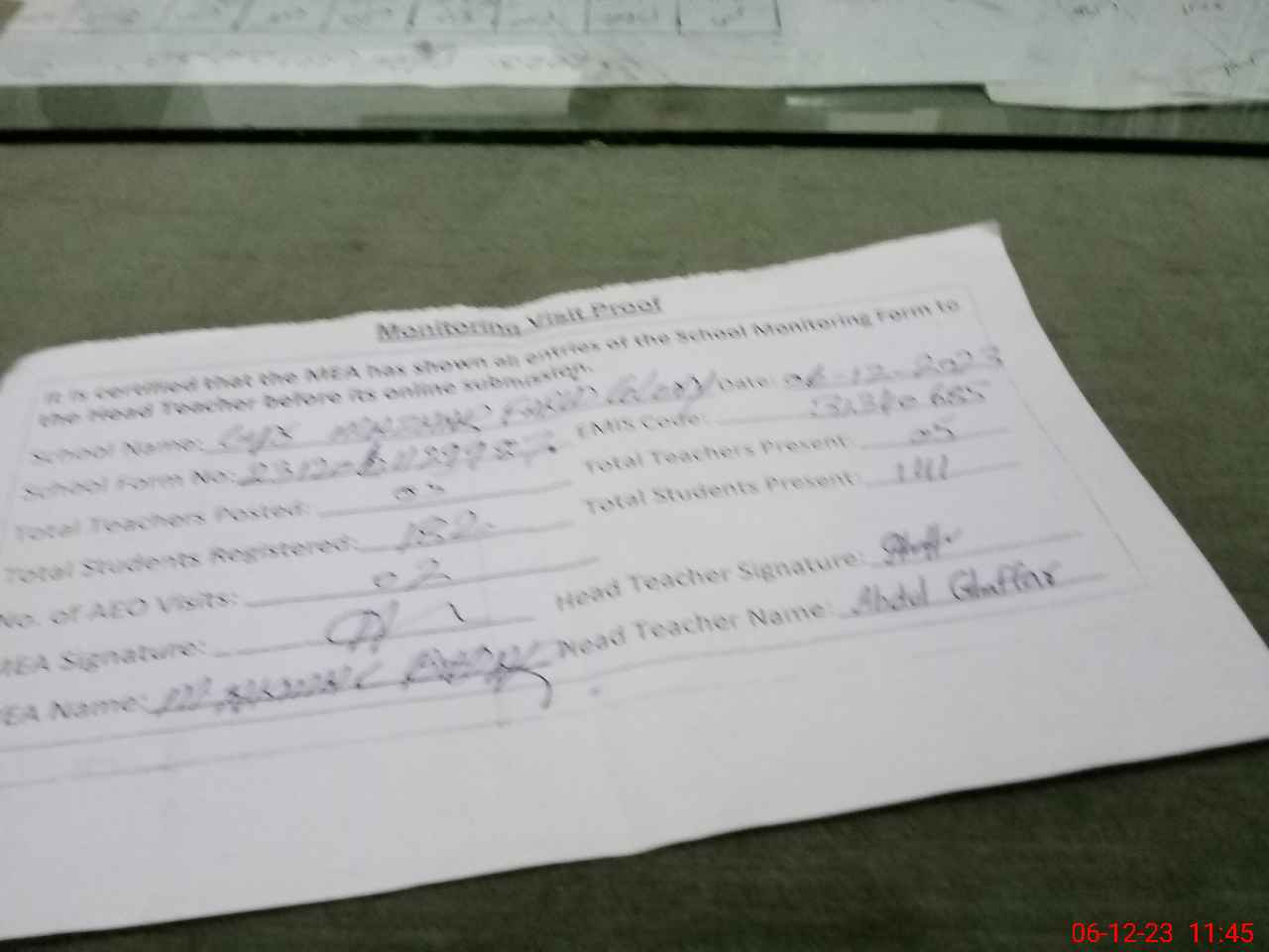 | Attendance Register | Head Teacher | MEA with School | Visit Proof |
