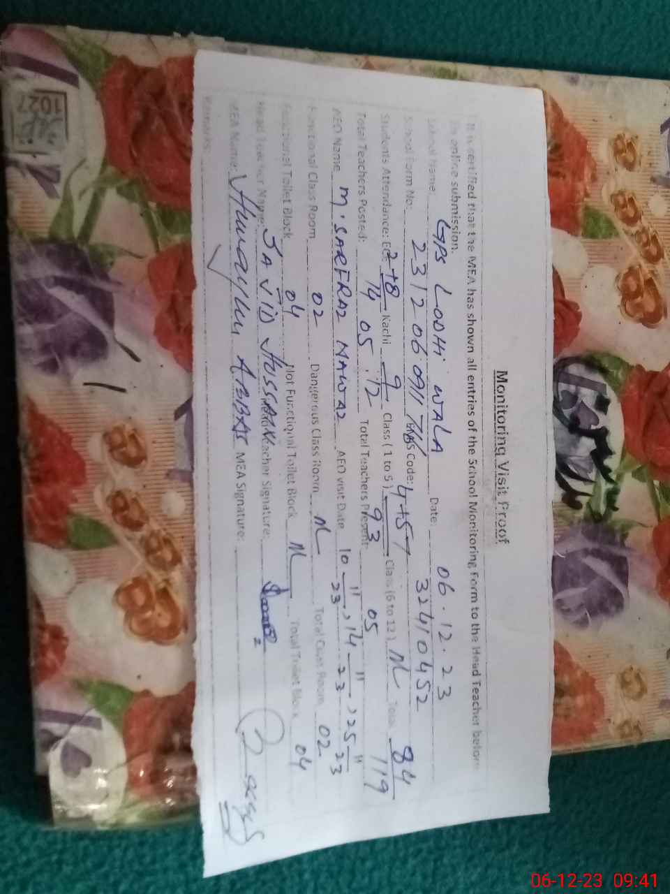 | Attendance Register | Head Teacher | MEA with School | Visit Proof |