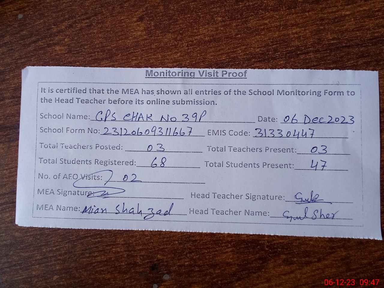 | Attendance Register | Head Teacher | MEA with School | Visit Proof |