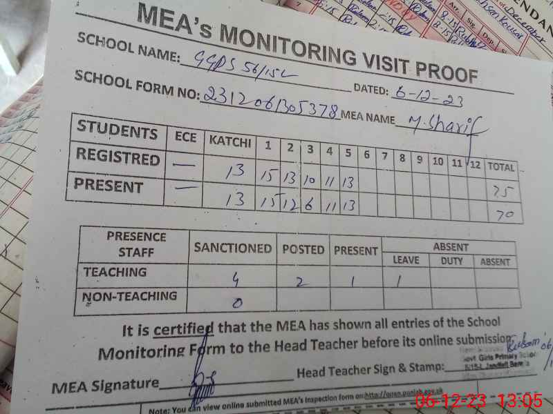 | Attendance Register | Head Teacher | MEA with School | Visit Proof |