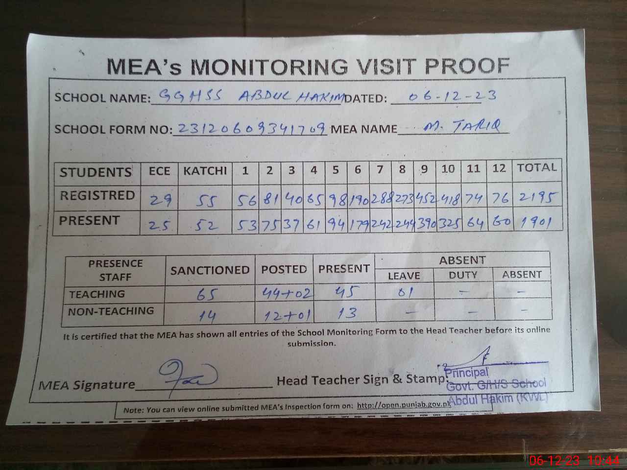 | Attendance Register | Head Teacher | MEA with School | Visit Proof |