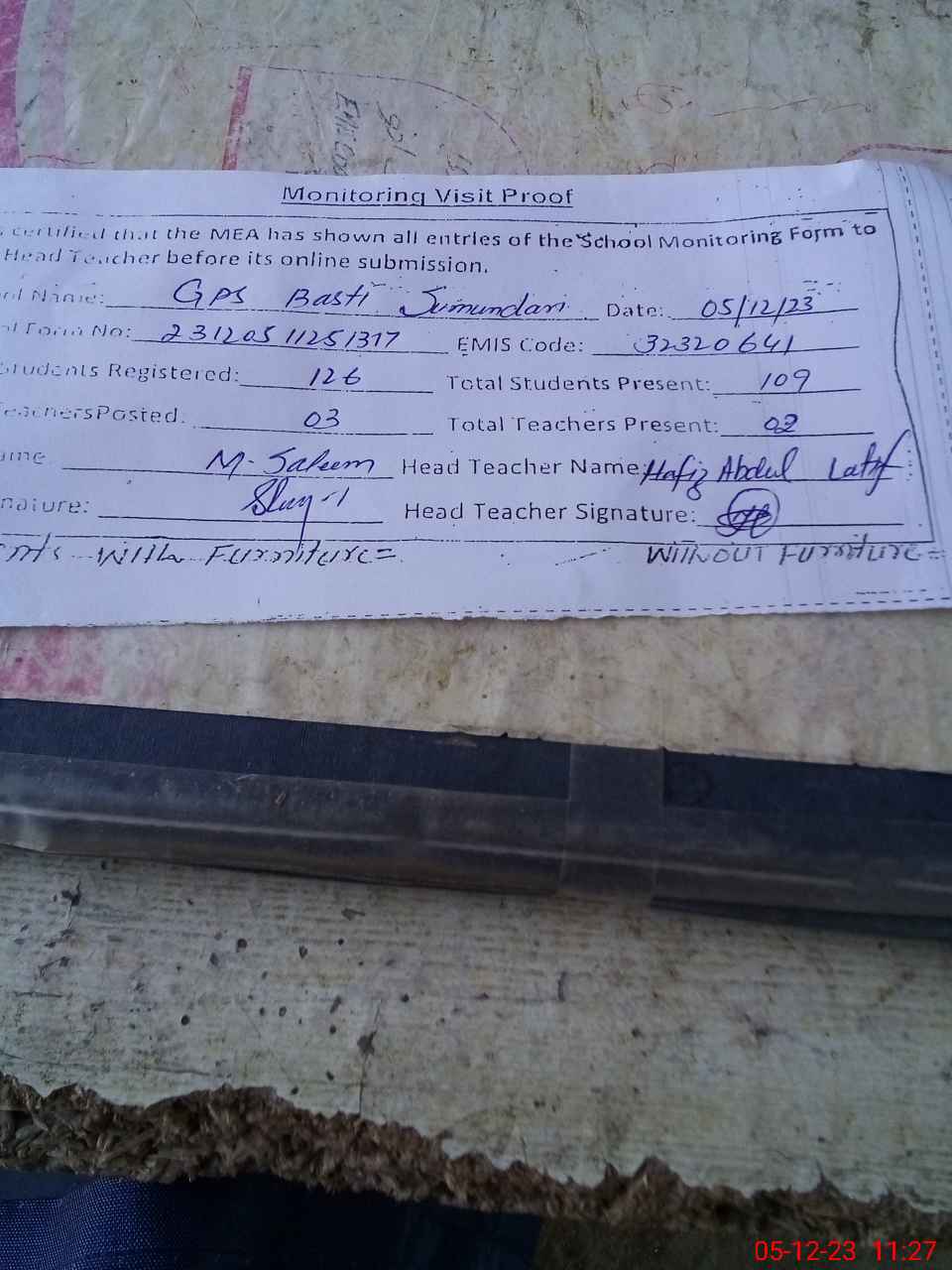 | Attendance Register | Head Teacher | MEA with School | Visit Proof |