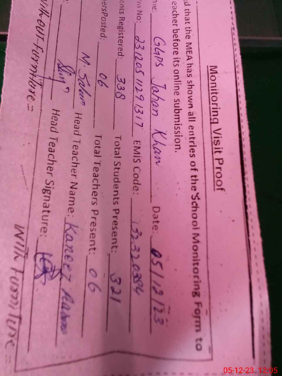 | EMIS Code: 32320384 | Name of School: GGPS JAHAN KHAN | |||