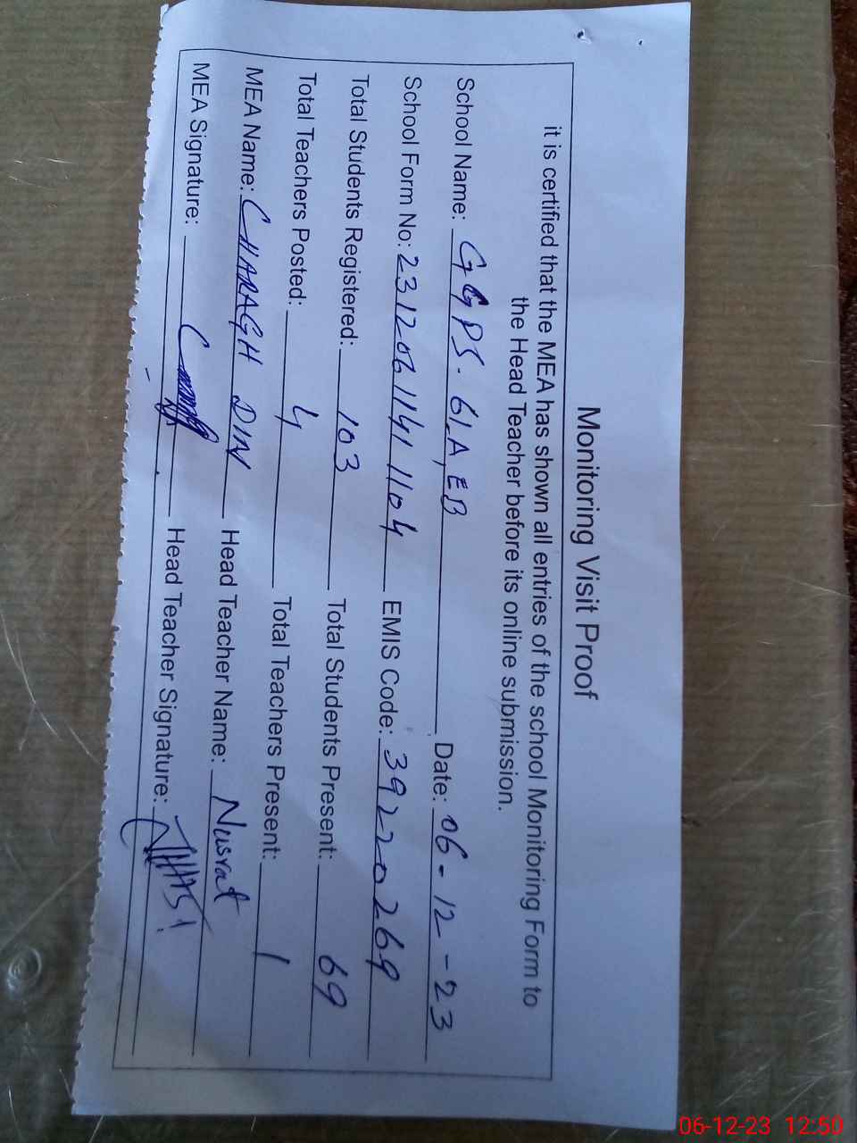 | Attendance Register | Head Teacher | MEA with School | Visit Proof |