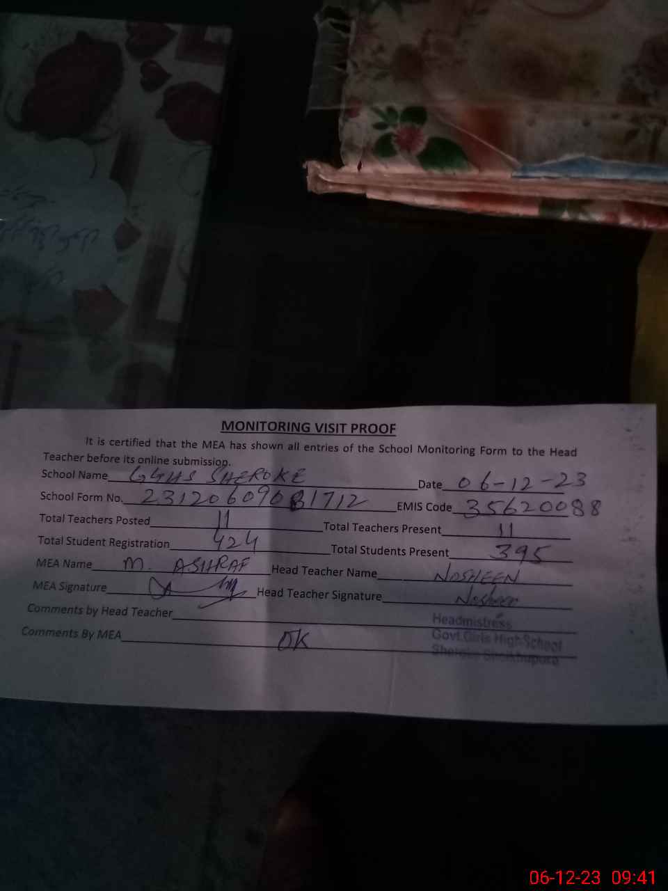 | Attendance Register | Head Teacher | MEA with School | Visit Proof |