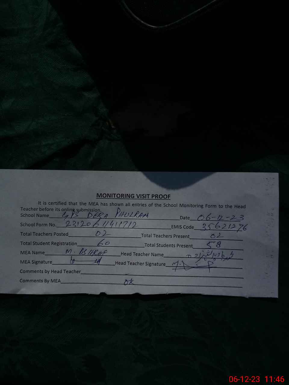 | Attendance Register | Head Teacher | MEA with School | Visit Proof |