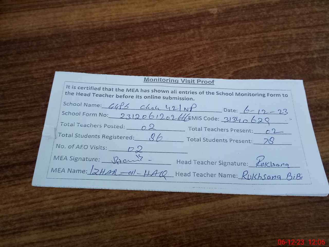 | Monitoring Date: 06-12-2023 | Start Time: 06-12-2023 11:35 AM | End Time: 06-12-2023 12:08 PM | Name of MEA: Mu**** Iz**** UlHa**** | |