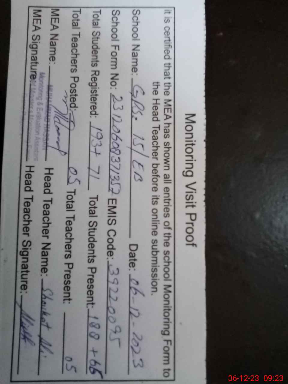 | Attendance Register | Head Teacher | MEA with School | Visit Proof |