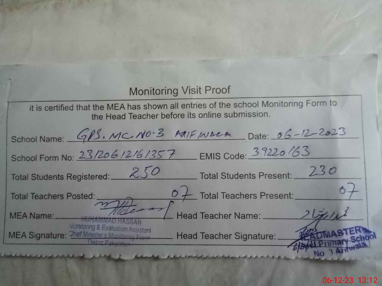| EMIS Code: 39220163 | Name of School: GPS NO. 3 ARIFWALA | |||