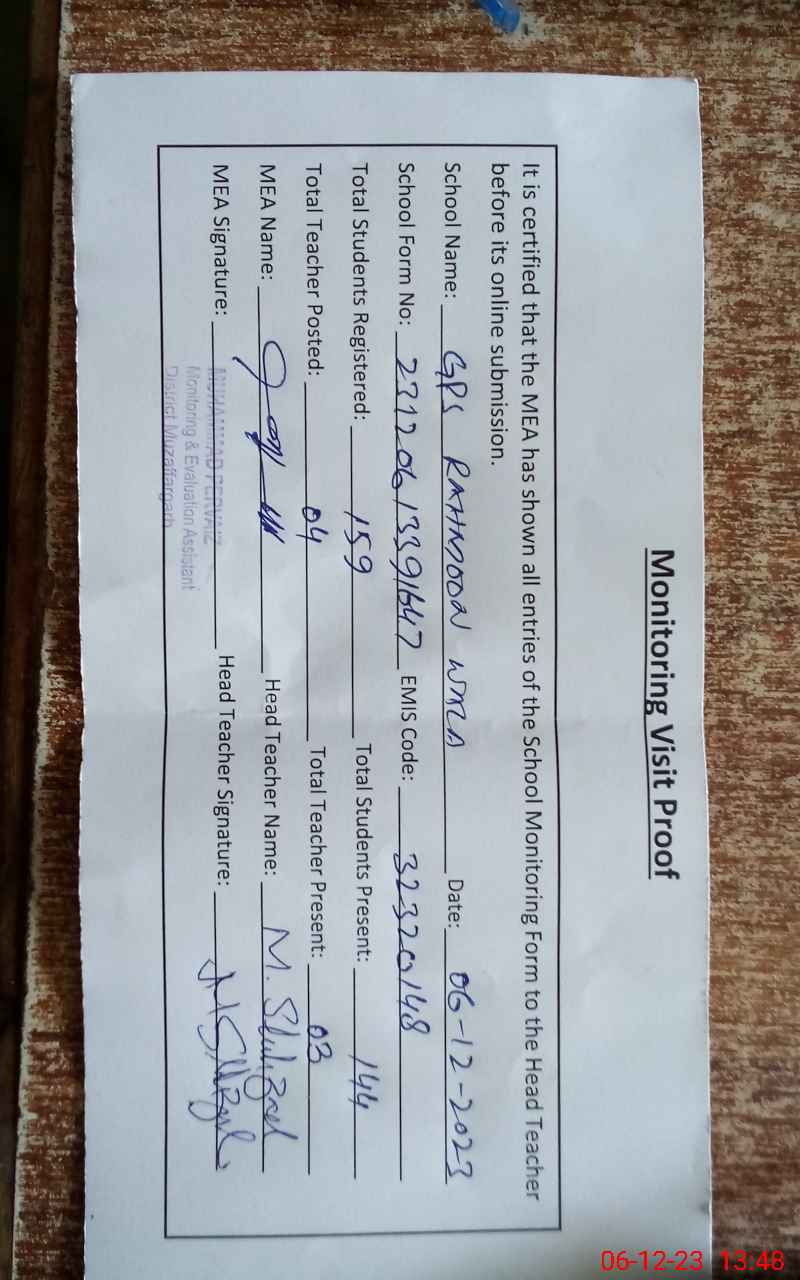 | EMIS Code: 32320148 | Name of School: GPS RAHMOON WALI | |||