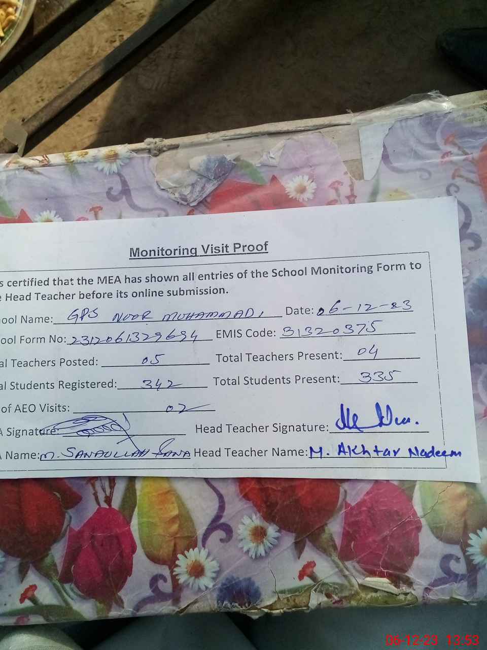 | EMIS Code: 31320375 | Name of School: GPS NOOR MUHAMMAD | |||