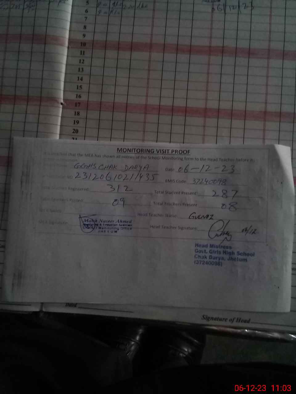 | EMIS Code: 37240098 | Name of School: GGHS CHAK DARYA | |||