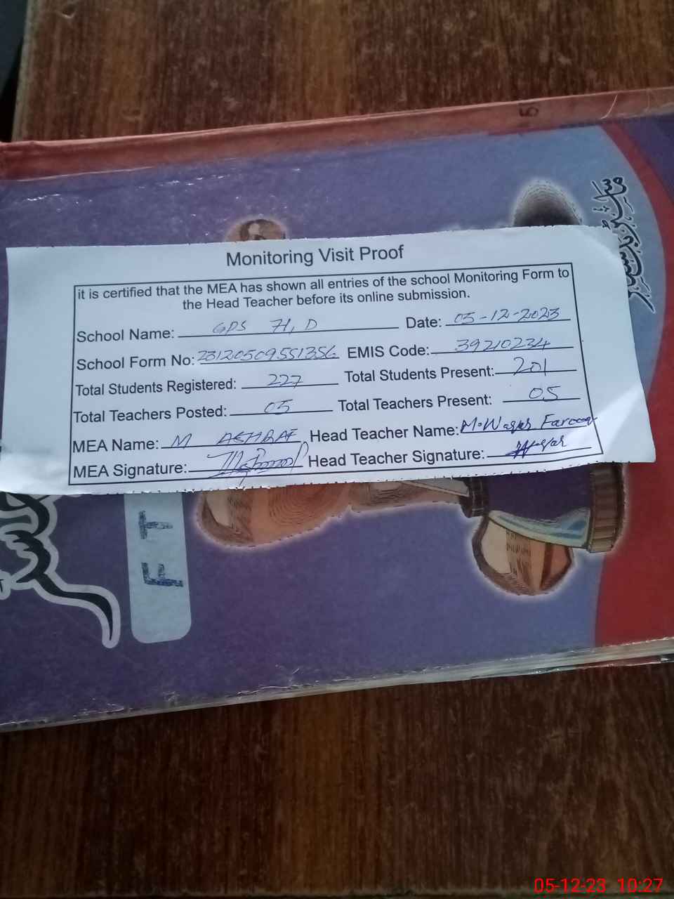 | EMIS Code: 39210234 | Name of School: GPS CHAK NO. 71 D | |||