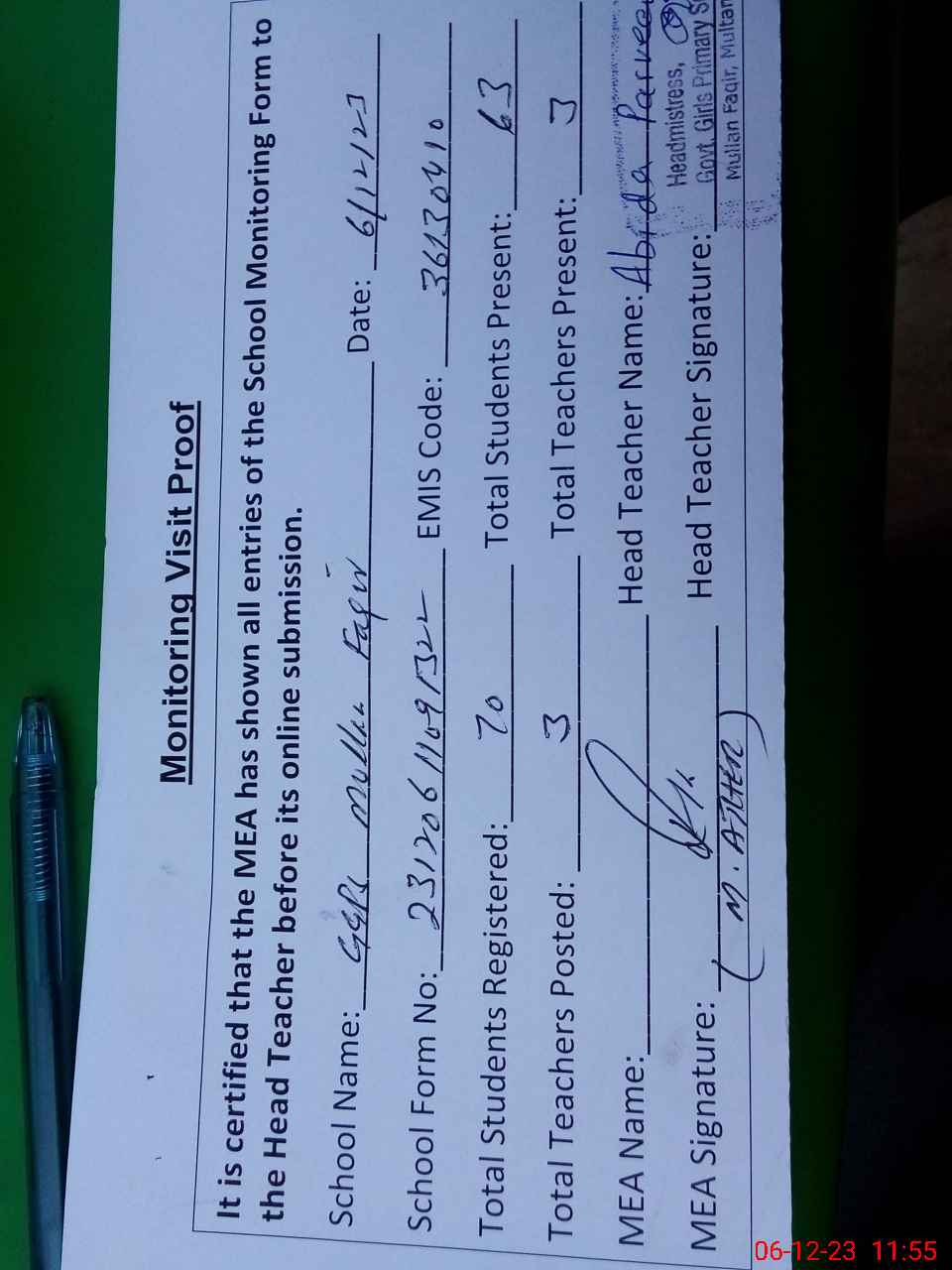 | Attendance Register | Head Teacher | MEA with School | Visit Proof |