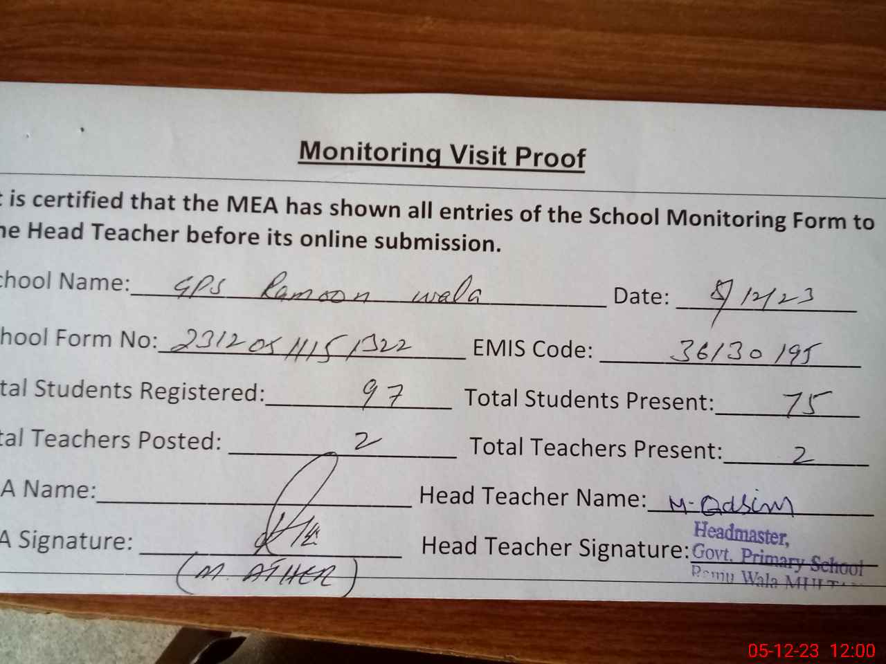 | EMIS Code: 36130195 | Name of School: GPS RAMOON WALA | |||