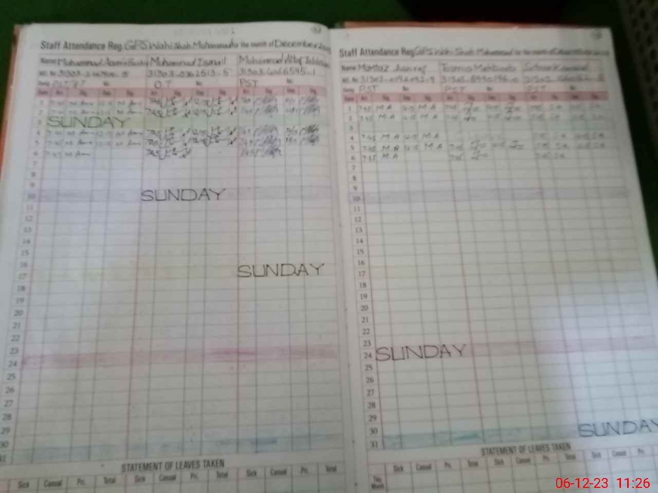 | CNIC | Full Name | Designation | R/C | Absence During Last Calender Month |