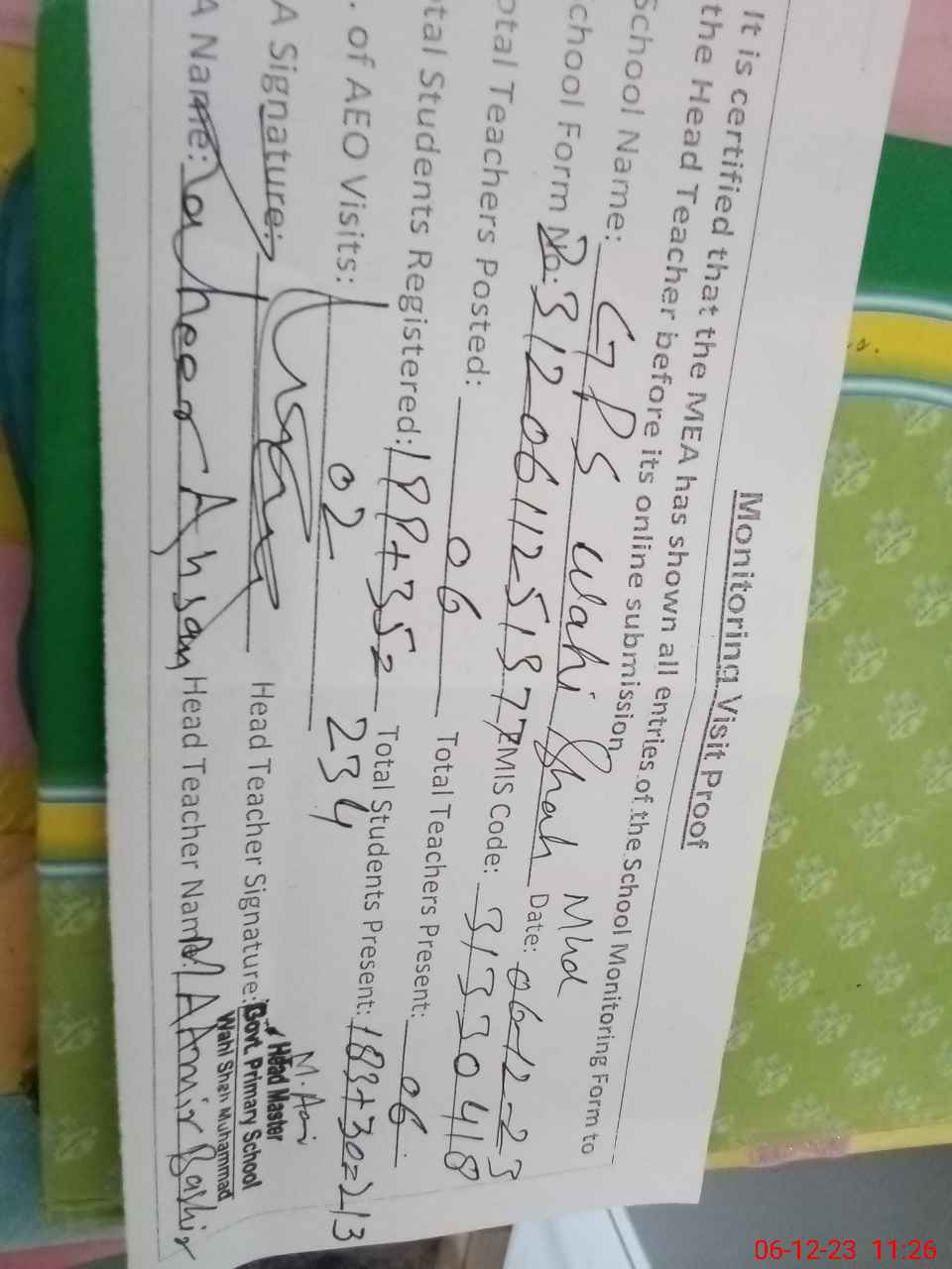 | EMIS Code: 31330418 | Name of School: GPS BASTI WAHI SHAH MUHAMMAD | |||