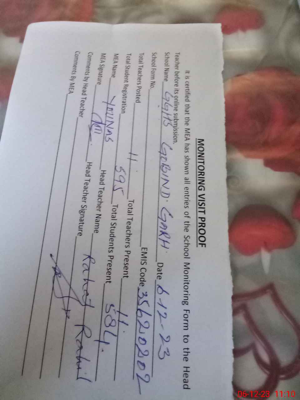 | Attendance Register | Head Teacher | MEA with School | Visit Proof |