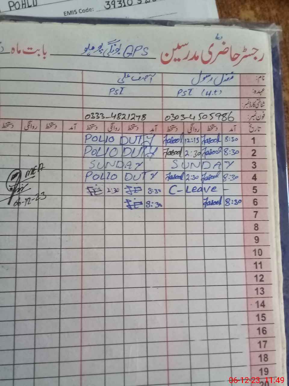 | Name: Fa**** Ra**** Designation: (School Headmaster's/Headmistress's) PST Phone/Cell Number: 03**** |