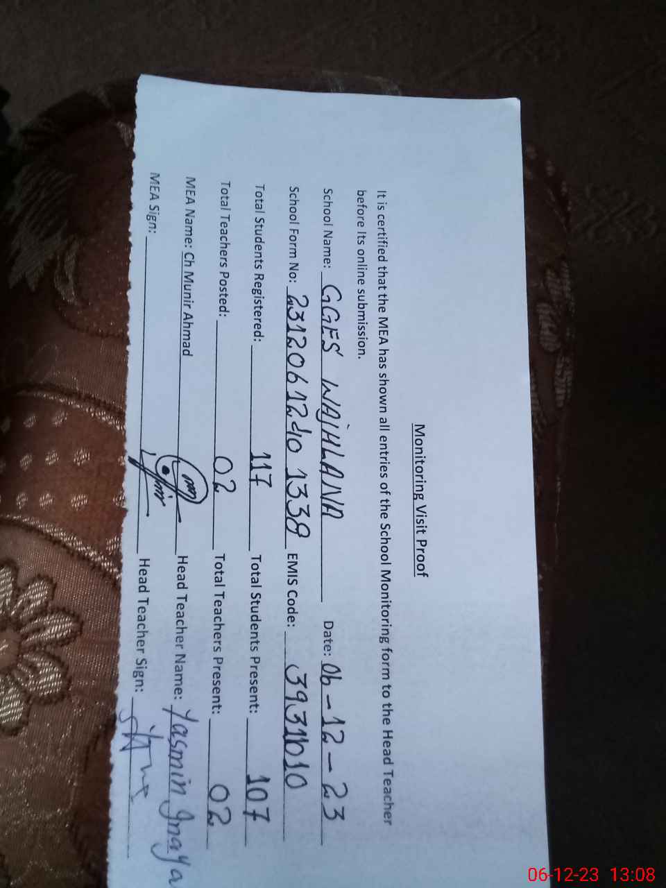 | EMIS Code: 39311010 | Name of School: GGES WAJHLANA | |||